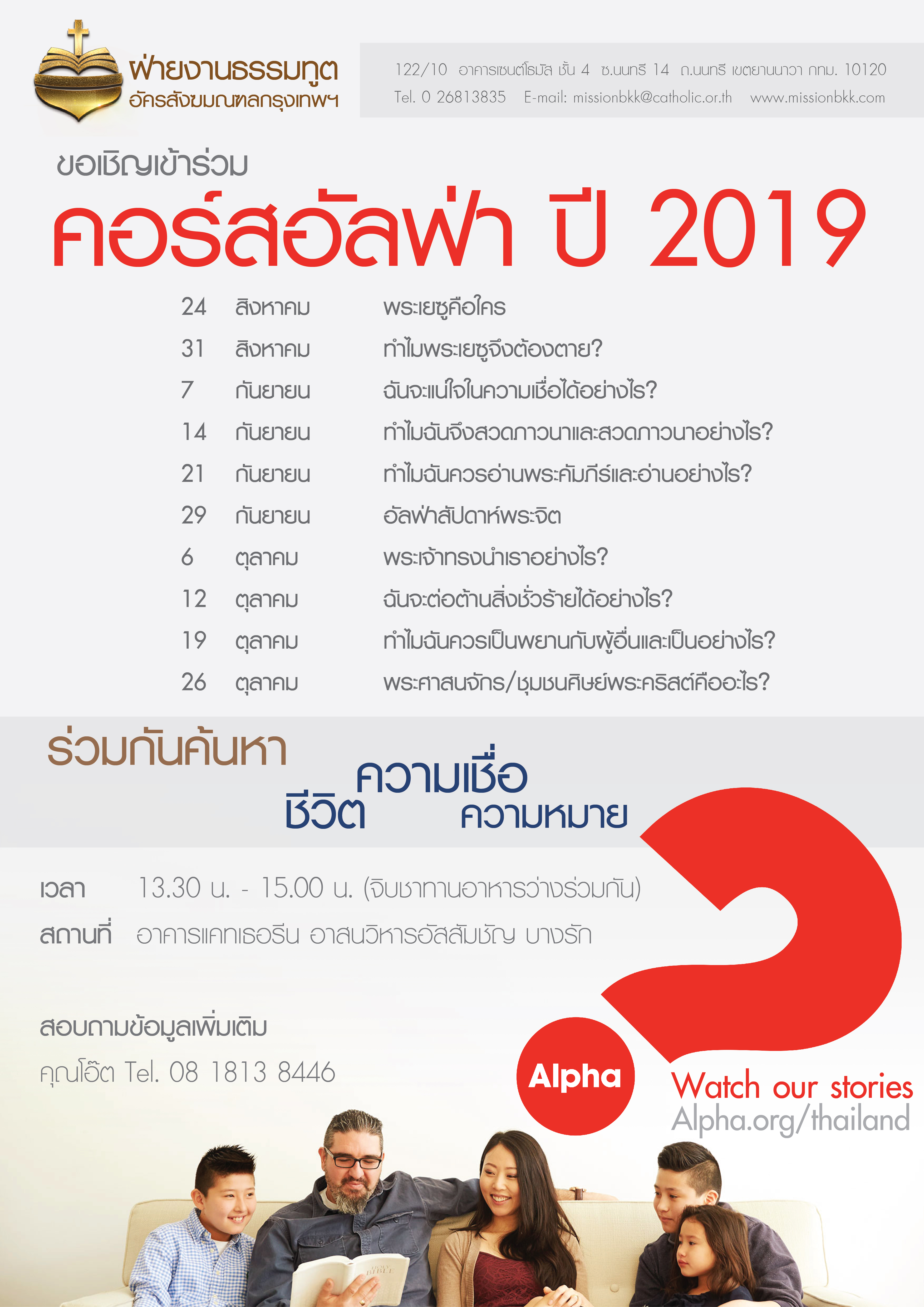 แผนกสนับสนุนงานธรรมทูต อัครสังฆมณฑลกรุงเทพฯ จัดอบรมให้ความรู้ ครั้งที่ 2 ประจำปี 2019 หัวข้อ “พระคัมภีร์กับการประกาศข่าวดี” โดย คุณพ่ออนุรักษ์ ประจงกิจ เป็นวิทยากรบรรยาย ให้กับผู้ผ่านการอบรมอาสาสมัครฯ ประกาศข่าวดีฯ (PMG BKK) และคริสตชนที่สนใจ ณ ห้องประชุมชั้น 2 ตึกวันทามารีย์ โรงพยาบาลเซนต์หลุยส์ วันเสาร์ที่ 10 สิงหาคม ค.ศ. 2019 มีผู้เข้าร่วมอบรมจำนวน 70 คน