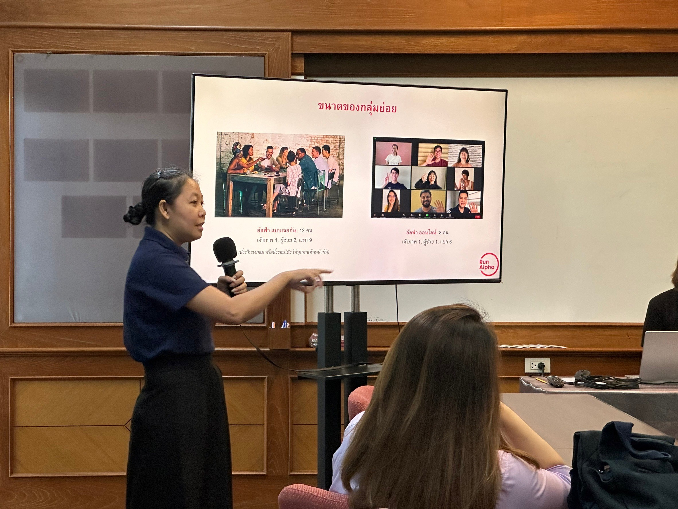 นอกจากนี้ ทีมงานยังได้จัดสาธิตจำลองการจัดคอร์สอัลฟ่าให้กับผู้เข้ารับการอบรม โดยให้ผู้เข้าร่วมได้ลองเป็นผู้ดำเนินการคอร์สอัลฟ่าด้วยตนเอง จากนั้น กลุ่มผู้เข้าร่วมของแต่ละวัด ได้ประชุมกันเพื่อวางแผนและกำหนดบทบาทของแต่ละคนในการจะดำเนินคอร์สอัลฟ่าในชุมชนวัดต่อไป